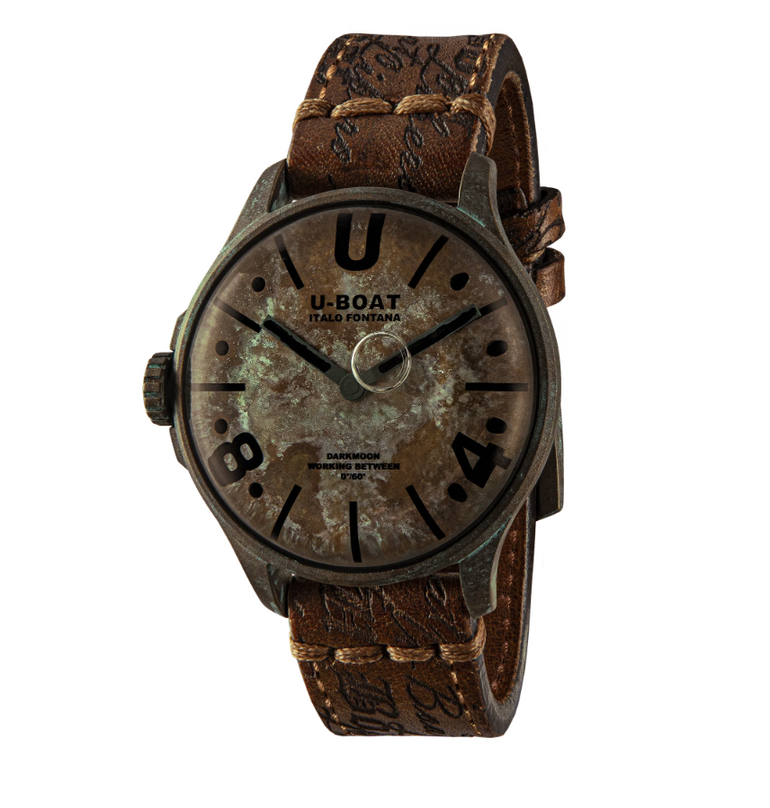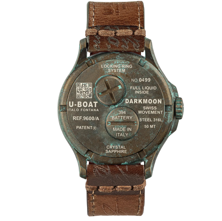Made of AISI 316L steel with aged bronze PVD treatment, completely filled with a special oil that enhances the dial, creating the illusion of absence of glass, with a more intense color effect and greater readability. Visible air bubble on the dial to compensate for temperature variations. Distinctive crown protector on the left. 46,50 mm diameter.