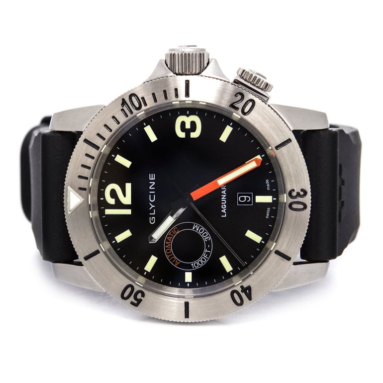 Glycine "Lagunare" Limited Edition of 300 pieces. COSC Certified Chronometer. Model 3875-19 LCC 3000 divers model with locking down rotating bezel, helium escape valve crown at 4 and bezel locking crown at 2, protective cap over the winding crown.