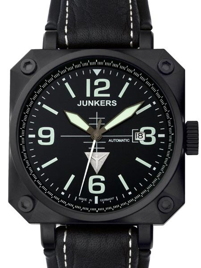 The dial of this new Junker series is styled after a horizon airplane instrument. Its case is reminiscent of those used in vintage airplane cockpits which were held down with four bolts. Green (glowing) SuperLuminova is used to treat the hands and indices and a Cal. 821A, 21 jewel automatic movement is used for reliable time keeping.