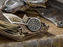 Pilot Watch Original - Model Paderborn Erbstuck. If you search the ebay for authentic world war II Luftwaffe pilot watch from Laco it will fetch around $5000-7000, today Laco employed a technique by casemakers of Pforzheim, Germany, capital of German case and band manufacturers, that make a traditional modern watch look like it was worn by a pilot and set around, maybe even buried in the ground, for over 75 years. There are 3 levels of severity of "natural damage" that Laco offers, this watch is a level 2. Heirloom pilot 45mm model 861938 "Dortmund Erbstuck" with aged black "Type B" aviation style dial on brown aviator style leather strap, manual wind Swiss made movement.