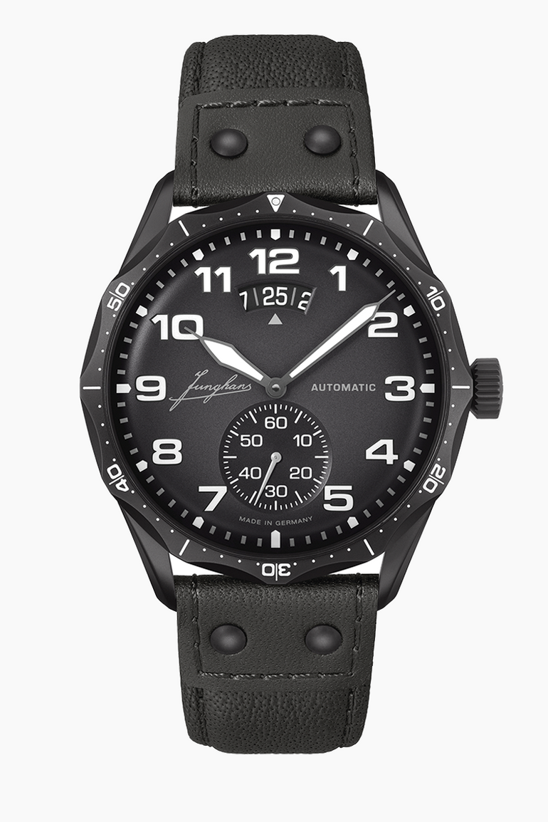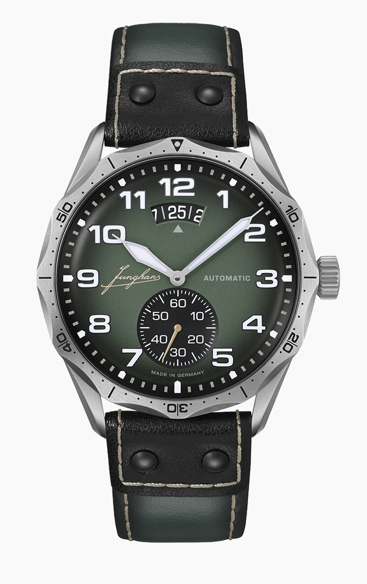 domed matt dark green effect lacquer, historical Junghans lettering, minute track with grey and hour numerals with white environmentally-friendly luminous substance, satin-finished hands, hour and minute hands with white environmentally-friendly luminous substance, grey lacquered second hand