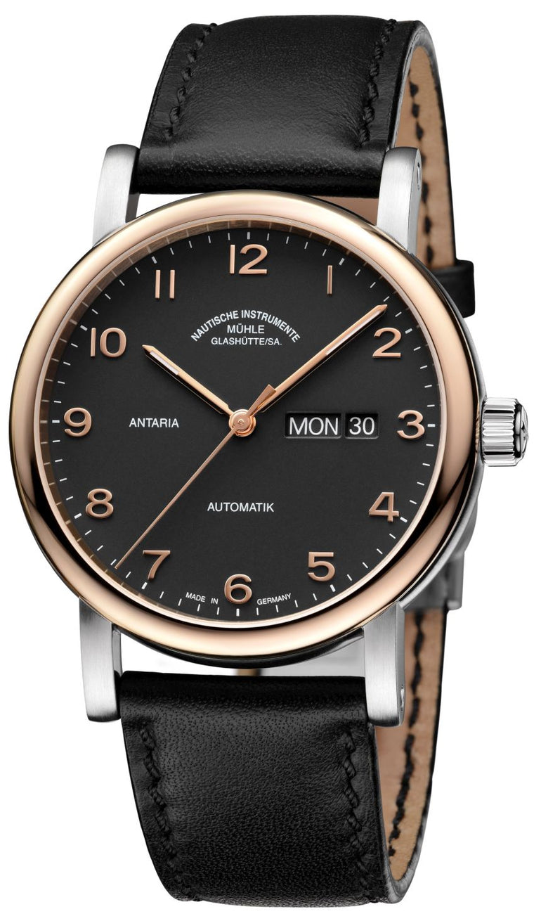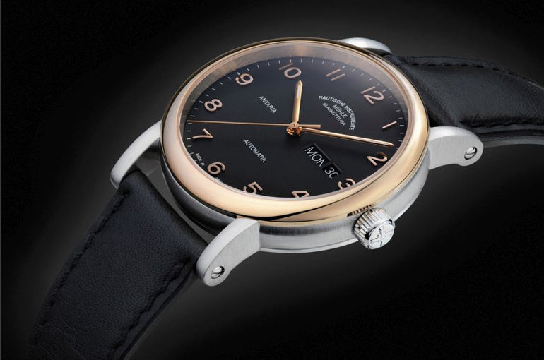 Brushed & polished stainless steel with a gold-plated bezel in the anthracite-colored model (10 Micron). Anti-glare sapphire crystal. Transparent case back. Screw-in crown. Ø 42.0 mm; H 11.5 mm