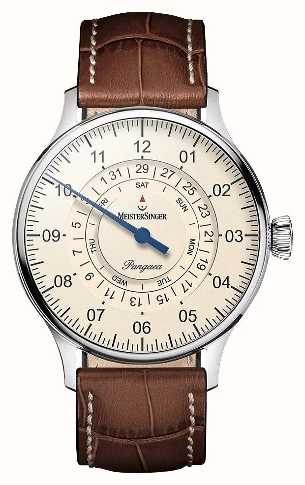 The Pangaea Day Date in MeisterSinger’s distinctive ivory hue has long since become a classic. The date and weekday rings are completely open, giving the dial both structure and depth. The centrally positioned single hand, elaborately blued by heat treatment, calmly rotates around the dial. A small red arrow at 12 o’clock points to the current date and the weekday.